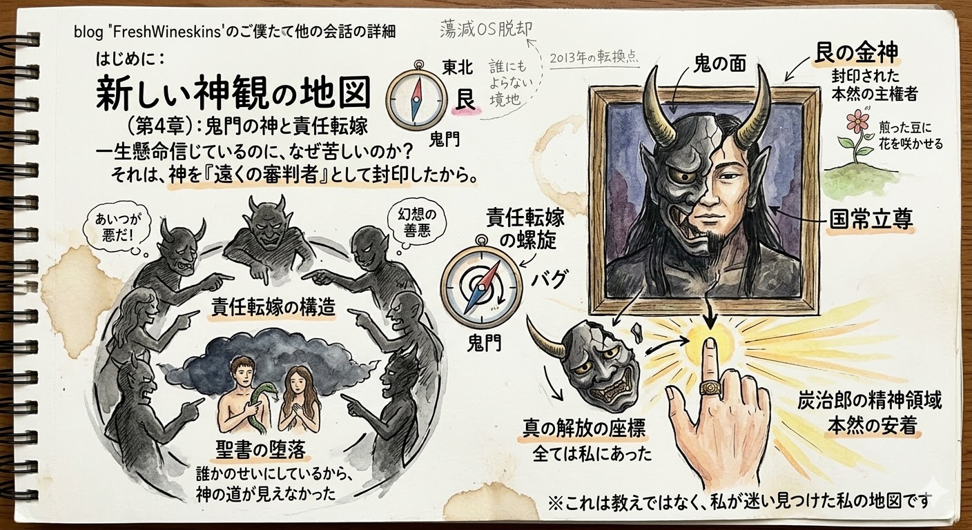 この瞬間に、人間は「神の子」という本然の主権を放棄し、「誰かのせいで不幸になった被害者」という幻想の二元論に転落しました。クニトコタチを鬼門に隠したように、私たちは神様という親との関係性を自らの手で切断し、「外側に悪を探す」という呪縛を自らにかけたのです。